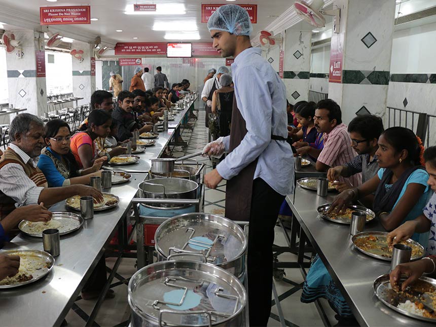 ISKCON Bangalore is providing free lunch prasadam for hundreds of pilgrims visiting the temple. The prasadam is served between 11:30 am and 2:00 pm every day. This initiative has been taken following in the footsteps of Srila Prabhupada, the Founder-Acharya of ISKCON who introduced prasadam distribution as one of the key programs of ISKCON temples all over the world. Distribution of food offered to the Lord has a great spiritual significance and is glorified in various scriptures.